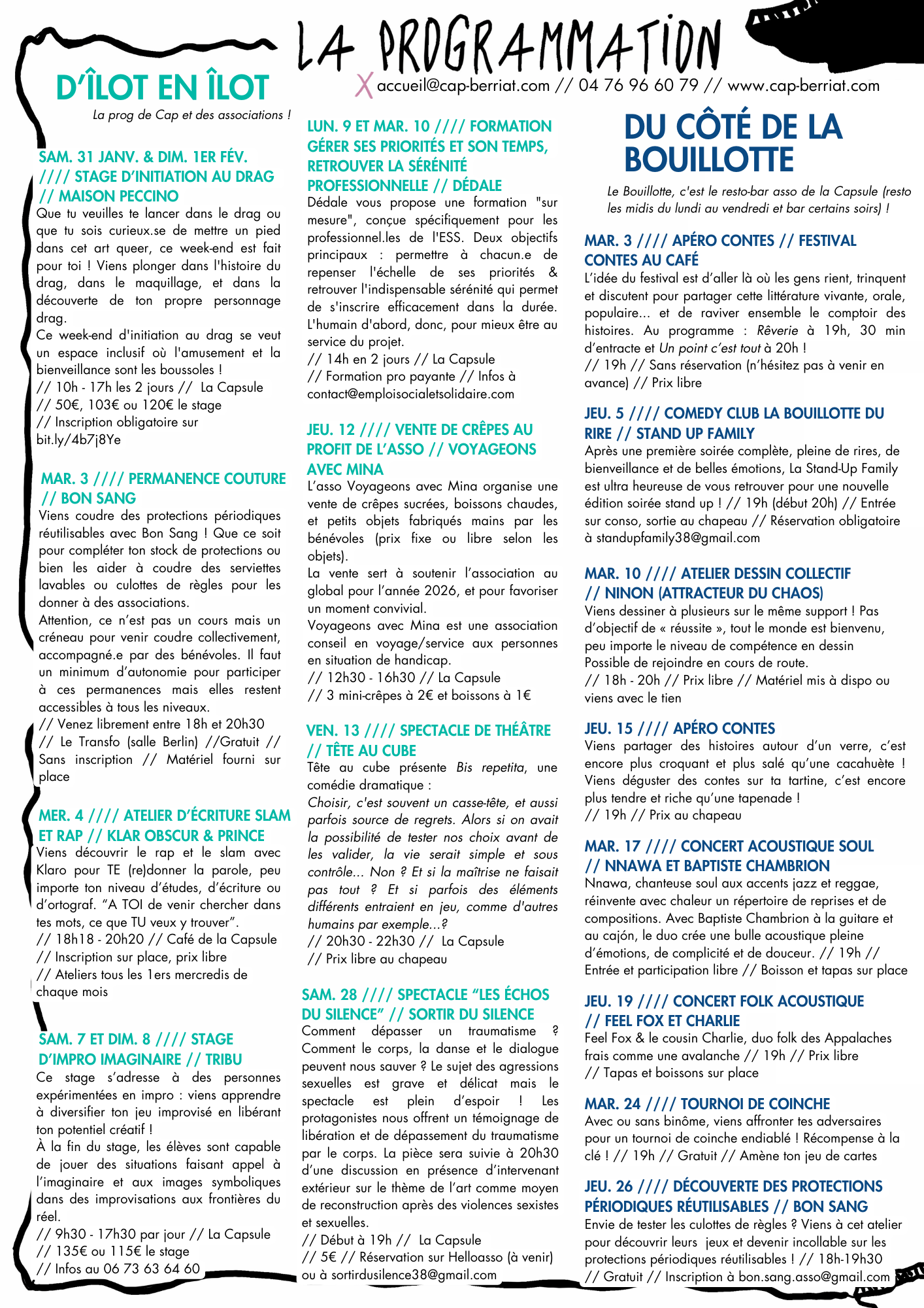 👉Tarif libre à l’entrée (conseillé entre 5 et 20€). A 19h dans la salle d’activité de la Capsule.
