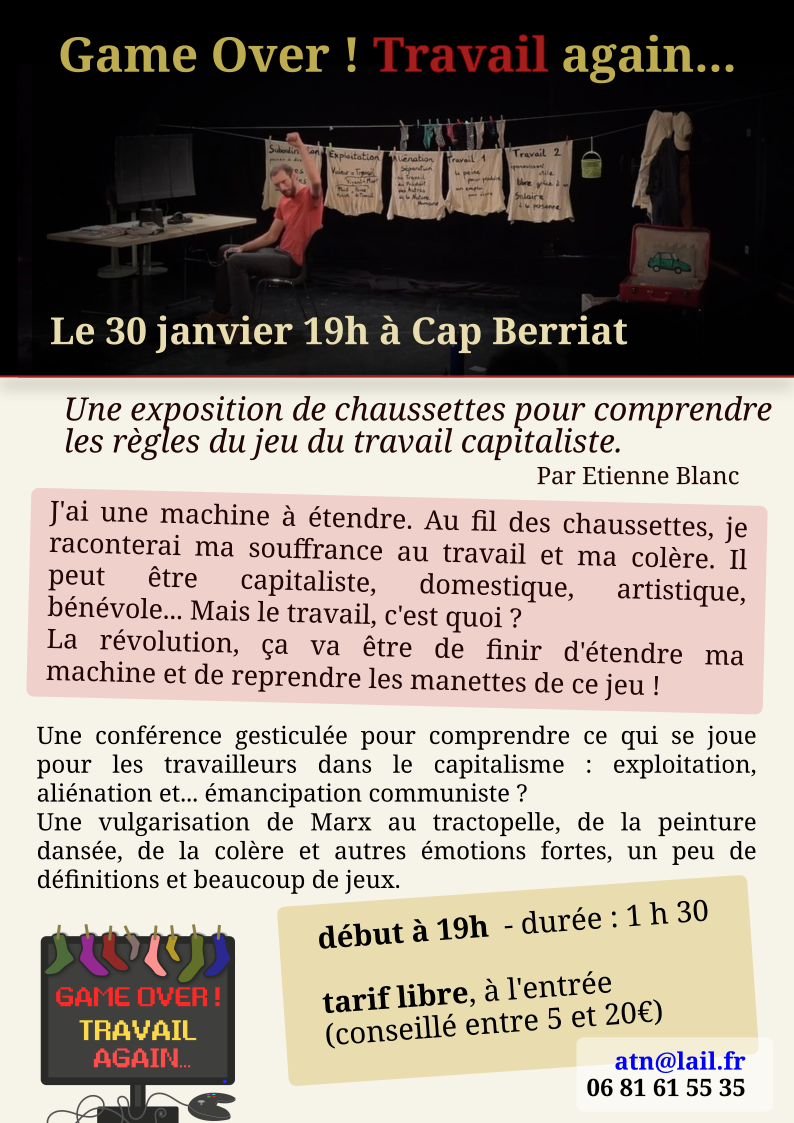 Une conférence gesticulée pour comprendre ce qui se joue pour les travailleur.euses dans le capitalisme : exploitation, aliénation et… émancipation communiste ? Une vulgarisation de Marx au tractopelle, de la peinture dansée, de la colère et autres émotions fortes, un peu de définitions et beaucoup de jeux.